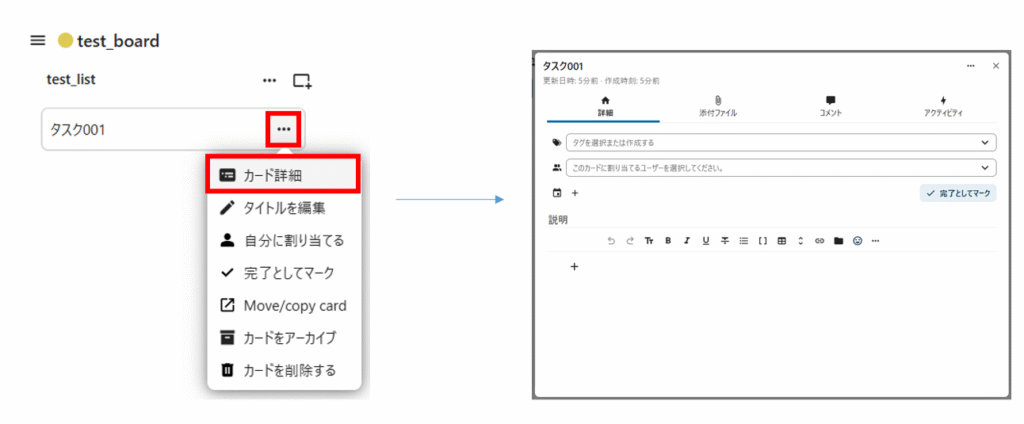 表示されたメニューの「カード詳細」をクリックしてカード内容を編集します。