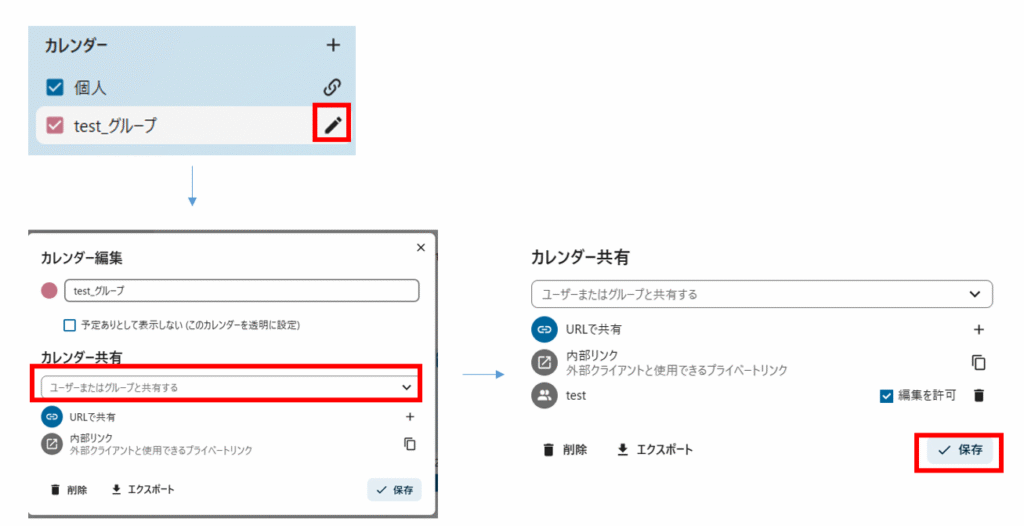 任意のカレンダーを選択→必要項目を入力→「保存」をクリックします。