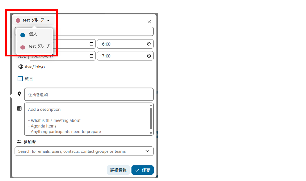 選択したカレンダーがグループと共有されている場合、予定はグループ予定として登録されます。