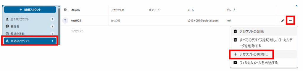 ユーザーの無効化を解除「無効なアカウント」→対象のユーザーの「」→「アカウントの有効化」でユーザーの無効化を解除できます。