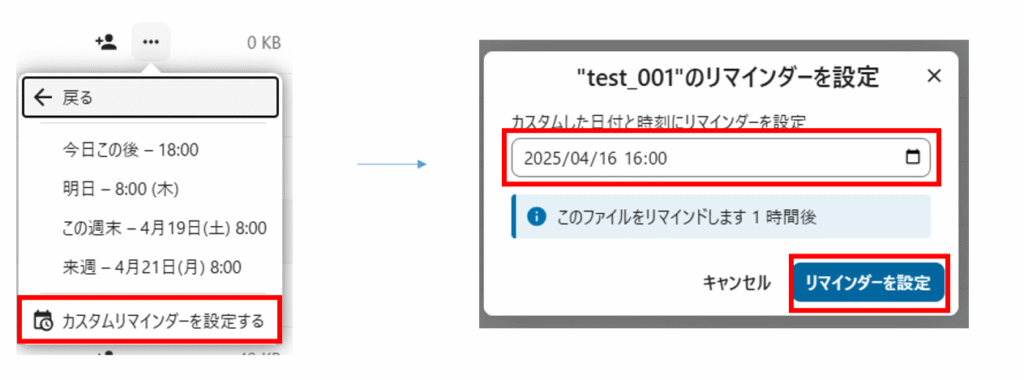 カスタムした日付と時刻を設定する場合、「カスタムリマインダーを設定する」をクリックします。