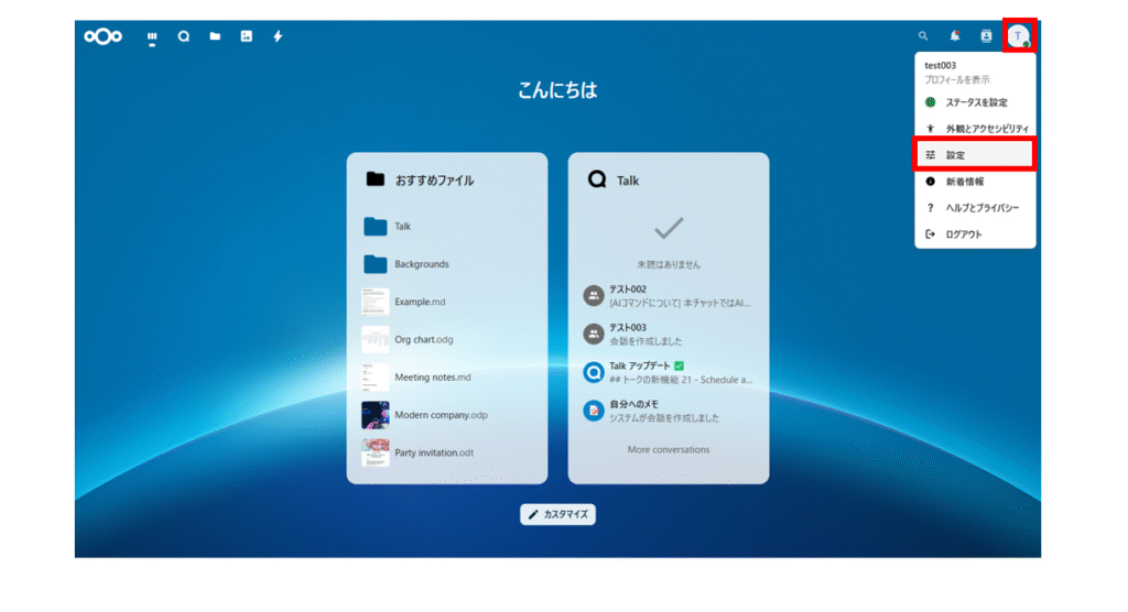 表示されたメニューの中の「設定」をクリックします。
