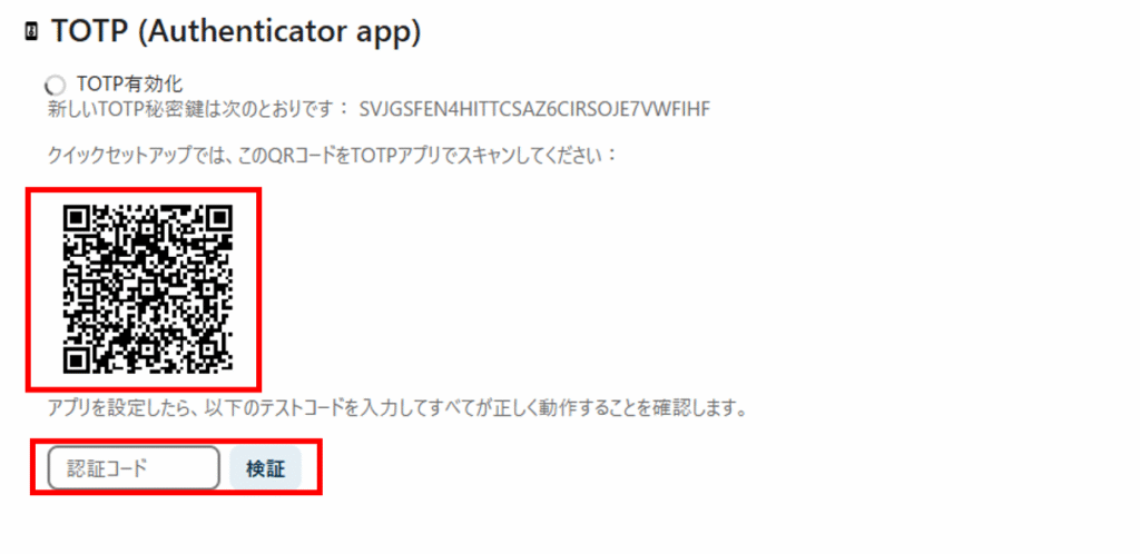 QRコードが表示されるので、TOTPアプリ(Google Authenticator など)で読み取ります。