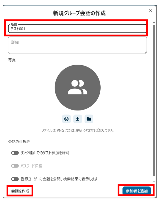作成画面が開くので、名前を入力し「参加者を追加」をクリックします。