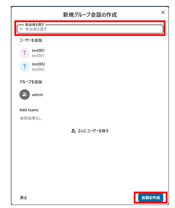 ユーザーをクリックして追加し、「会話を作成」をクリックします。