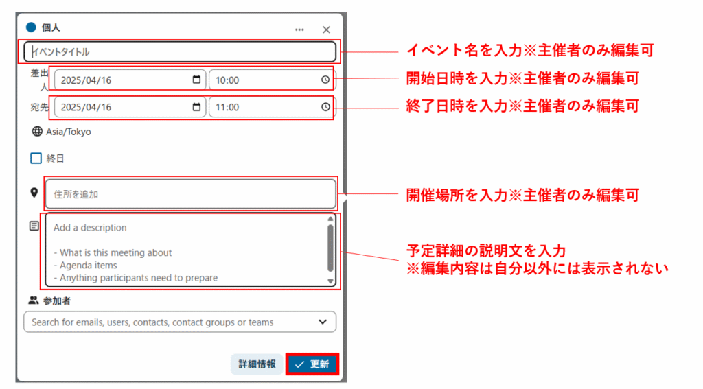 「詳細情報」をクリックすると、予定の詳細設定を編集できます。