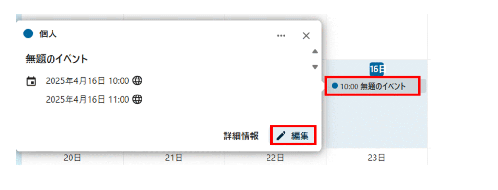 予定の詳細が表示されるので、「編集」をクリックします。