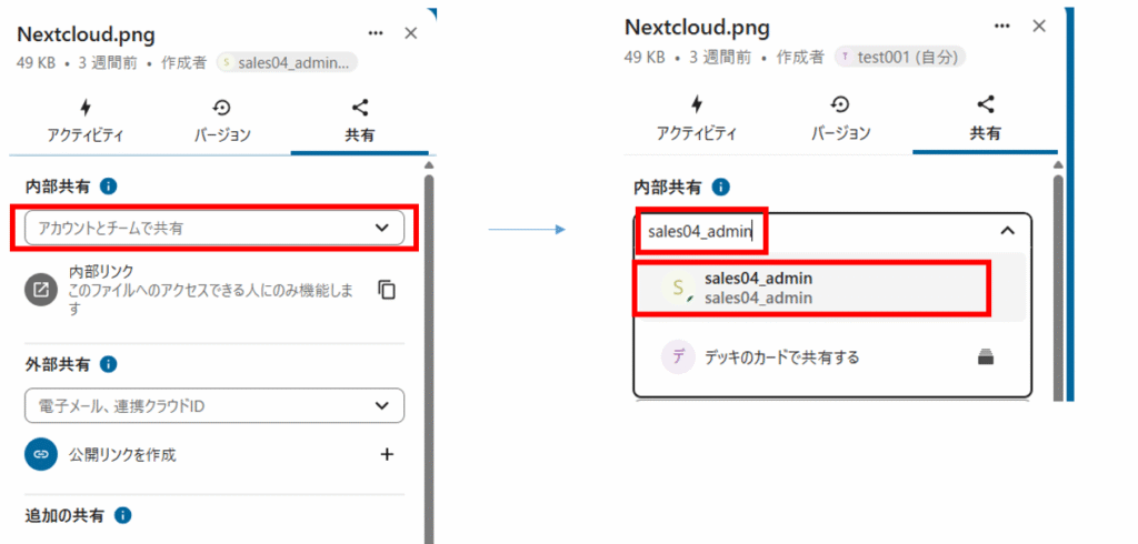 共有先のアカウント名もしくはアドレスを入力し、該当のアカウントをクリックします。