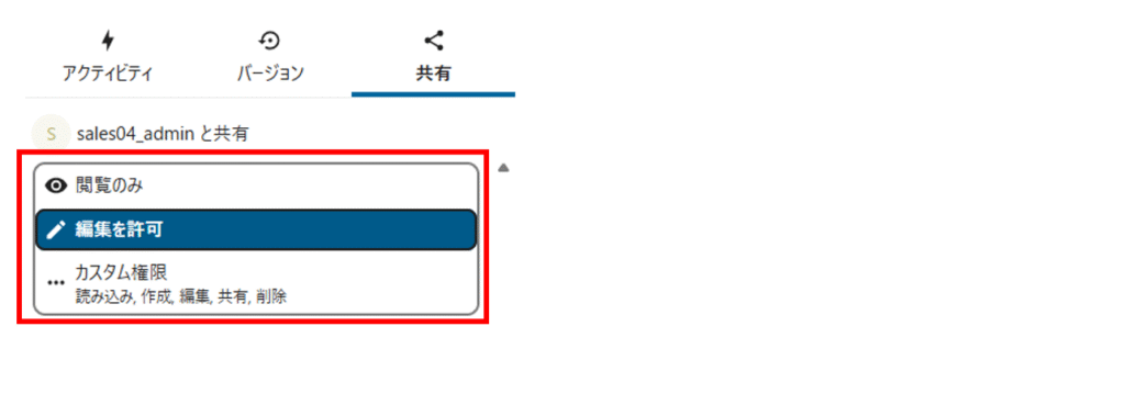 「カスタム権限」:編集、共有、削除の権限を設定できます。チェックを入れると、ファイルへの権限は自動的にカスタム権限に変更されます。