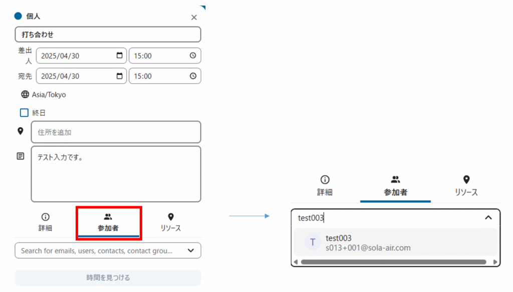 詳細情報で必要項目を入力→「参加者」タブをクリック→招待するユーザーの名前もしくはアドレスを入力します。