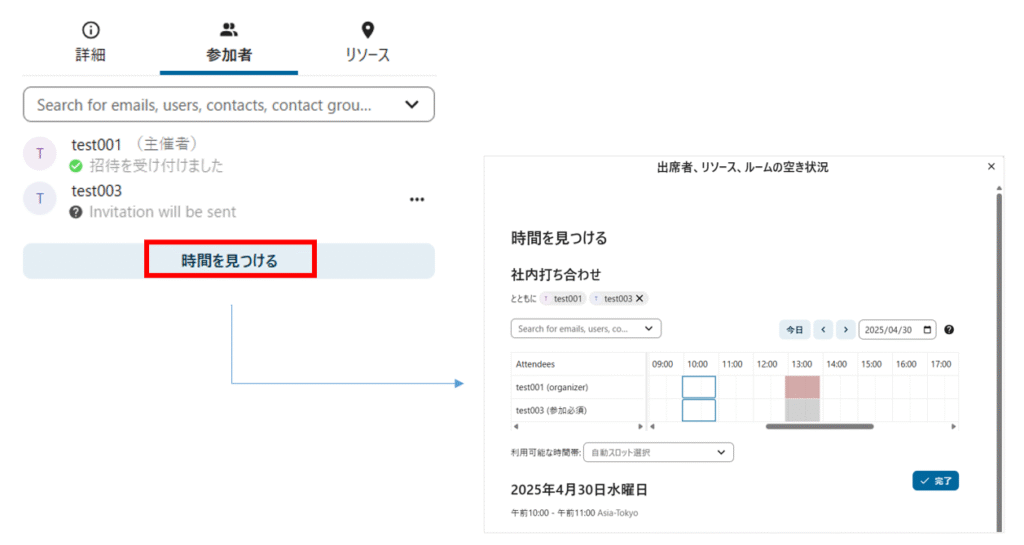 招待するユーザーをクリック→「時間を見つける」をクリックします。参加者同士のカレンダーが表示されるので、他の予定と重複しないか確認しながら時間を見つけることができます。